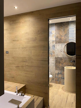 Il risultato è una casa calda, accogliente e moderna dove la pietra leccese la fa da padrona: dalle soglie delle grandi finestre che circondano tutta la proprietà alle pareti con rivestimento a posa sfalsata fino al bellissimo lavabo a colonna da centro stanza presente nel bagno padronale, finemente realizzato da un unico blocco in pietra.